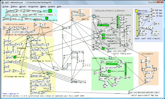 Prévu pour une utilisation scénique et pour des performances live, le Vétronome est un patch réalisé en PureData, et permet, grâce à une synchronisation midi sur un playback Cubase par exemple, de remplacer un chef d’orchestre pour les petites configurations ou pour s’entraîner.